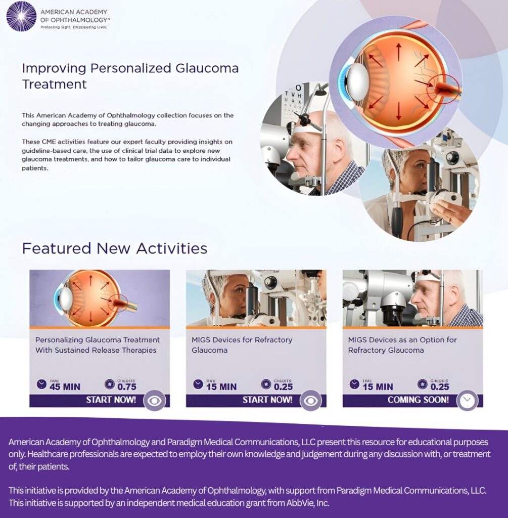 These CME activities feature our expert faculty providing insights on guideline-based care, the use of clinical trial data to explore new glaucoma treatments, and how to tailor glaucoma care to individual patients.